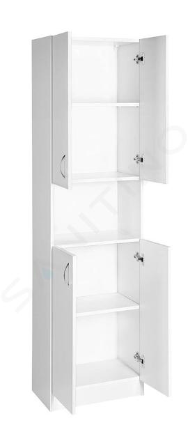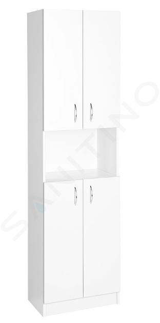 Der Schrank ist aus hochwertigem MDF/Laminat gefertigt, das dank seiner Langlebigkeit perfekt für das Badezimmer geeignet ist. Das matte Weiß verleiht den Oberflächen ein zeitloses Aussehen und vermittelt ein Gefühl von Sauberkeit und Sanftheit. Der Schrank ist leicht zu warten. Der Schrank ist oben und unten mit Doppeltüren ausgestattet, hinter denen sich ein Regalsystem befindet. Hier können Sie alles, was Sie brauchen, bequem unterbringen. Die einfache Handhabung der Tür wird durch verchromte Griffe gewährleistet. Um die Handhabung zu erleichtern, wird der Schrank zerlegt geliefert (Flat Pack).