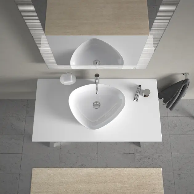 Asymmetrischer Waschtisch auf Platte / Schrank