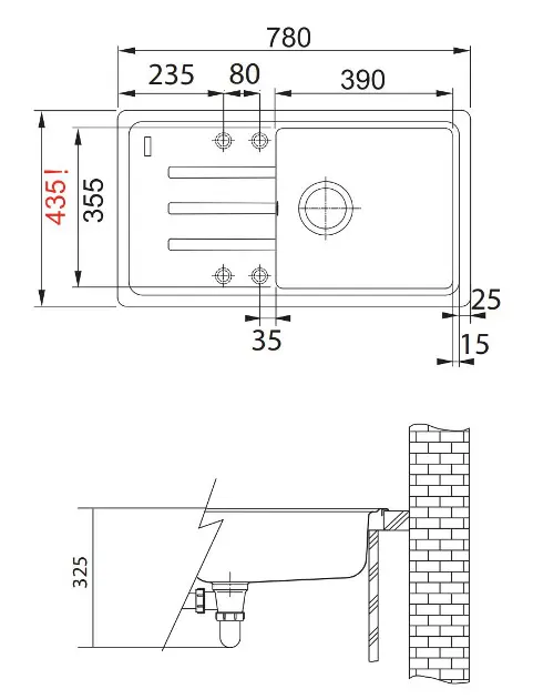 Spülbecken: 390 mm x 355 mm x 200 mm