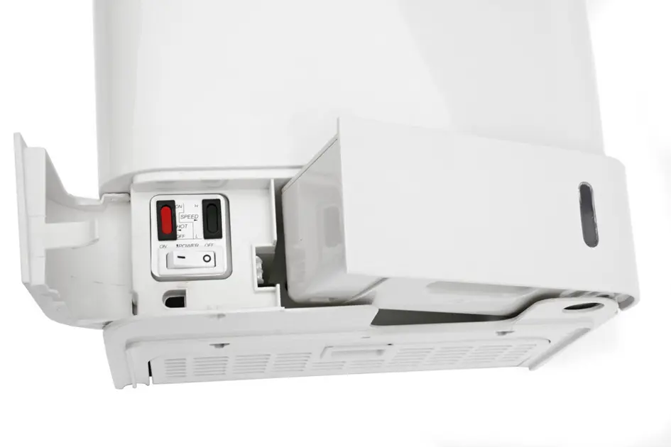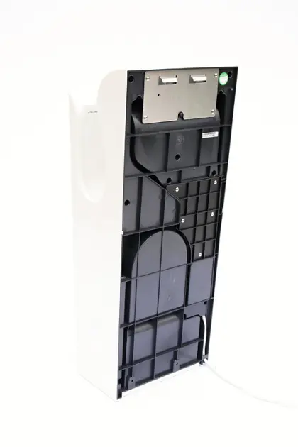 Beim Einschieben und langsamen Herausziehen der Hände aus dem Trockner wird das Wasser wortwörtlich sofort durch einen starken und warmen Luftstrom in die Abtropffläche abgeleitet. Für den Luftstrom sorgen die Kammdüsen, die sich an beiden Seiten des Trockners befinden. Das Abtropfwasser läuft dann über einen Kanal in den Abtropfbehälter an der Unterseite des Gerätes.