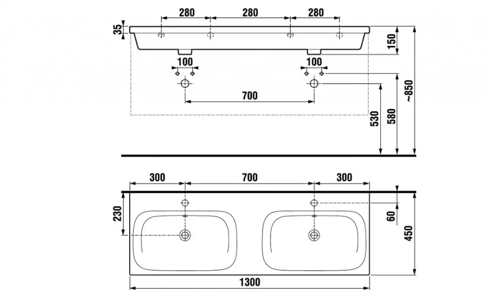 Doppelwaschbecken mit Überlauf, zwei Hahnlöcher