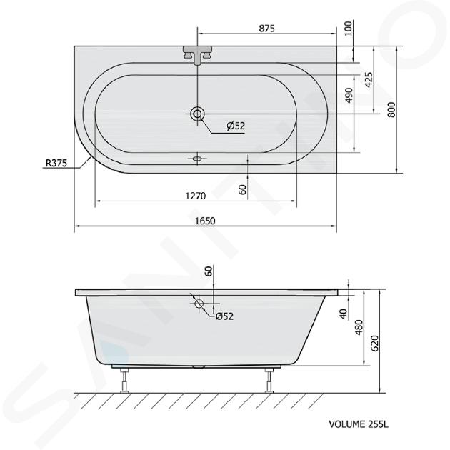 Asymmetrische Badewanne Astra R, rechts Abmessungen: 1650 x 800 x 480... Vollständige Beschreibung anzeigen