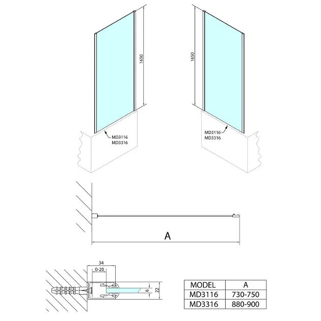 Feste Duschwand Deep für tiefe Duschwanne Einbauabmessungen: 890 mm... Vollständige Beschreibung anzeigen